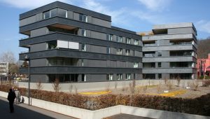 The facade of the multi-family residence in Baden’s Casino district is defined by horizontal strips of natural slate and metal. The effect is further enhanced by sliding windows and sliding shutters. The district surrounding the casino in Baden boasts generous green areas and a stock of old trees. Mansion Römerpark is situated at the heart
