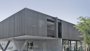 A curtain of brown aluminum profiles surrounds the top story of the multifamily residence in Diepoldsau. Folding sliding shutters allow the residents to open the curtain to suit their needs. The Villa Savoye, built in 1931 by Le Corbusier in Poissy near Paris, is considered to be a radical counter-design to the rigid construction style