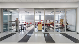 As education facilities evolve into more flexible spaces, operable walls and sliding doors are more frequently specified. An operable wall divides available space enabling flexibility whilst sound rated panels still allow for effective noise control. Flexible Properties of Space Fluidity represents the design of space for flows of individuals, sight, sound, and air. Educators must